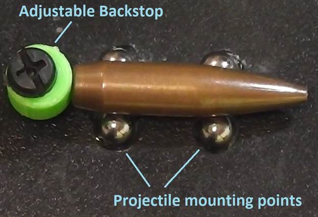 Place the projectile on the ball bearings as shown. Adjust the backstop to ensure that the projectile is seated securely. The motor drive can be used to pull the projectile back onto the backstop as it rotates the projectile.